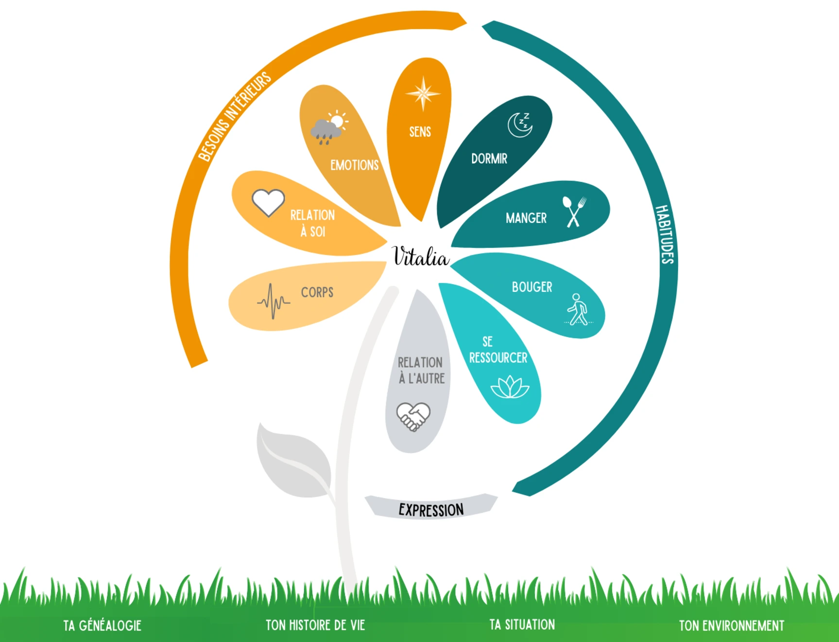 Vitalia est une fleur aux 9 pétales : ton corps, ses symptômes et tes sens. Ta relation à toi — amour de toi, confiance, dialogue intérieur. Tes émotions et ta capacité à les ressentir, les exprimer, les accueillir. Le sens que tu donnes à ta vie. La qualité de ton sommeil. La façon dont tu manges. Comment tu bouges au quotidien. Ta capacité à te ressourcer — joie et plaisir sans objectif. Et ta relation à l'autre — la liberté d'être toi en lien.